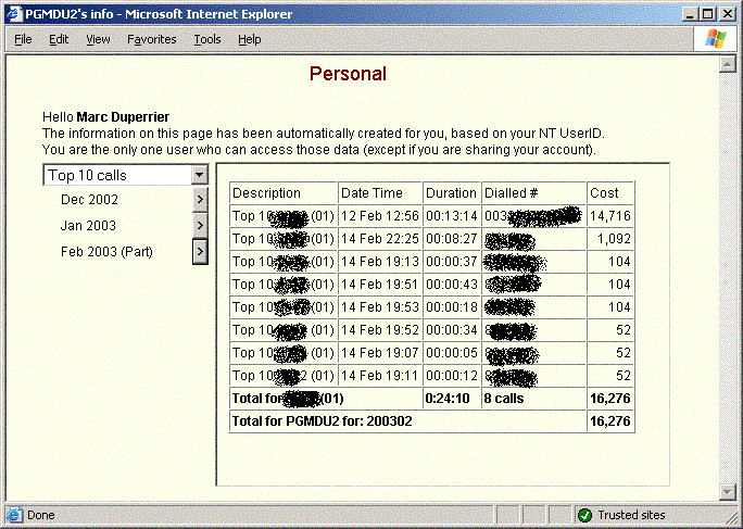 This application as been written with the main goal of improving telephone cost reporting capability. It as been written from scratch. Calls information are downloaded from the PABX every night with a custom script (later compilled as an executable) to a SQL 2000 databases. All check are made to ensure the validaty of the data.